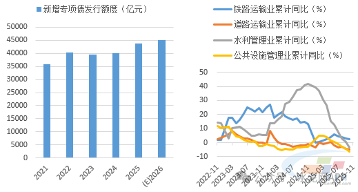 基建方面,我們判斷2026年投資將回正,基建端水泥需求將有改善?!笆逦濉币?guī)劃建議指出,加強(qiáng)謀劃論證,實(shí)施一批重大標(biāo)志性工程項(xiàng)目,高質(zhì)量推進(jìn)國家重大戰(zhàn)略實(shí)施和重點(diǎn)領(lǐng)域安全能力項(xiàng)目建設(shè)。2026年作為“十五五”開局之年,預(yù)計(jì)專項(xiàng)債、超長期特別國債發(fā)行規(guī)模將出現(xiàn)提高,基建投資將出現(xiàn)回正,但在化債政策影響下,水泥需求關(guān)系密切的交通類和市政基建投資或?qū)⒀永m(xù)低迷態(tài)勢,預(yù)計(jì)基建整體對水泥需求支撐將有所改善,但力度可能仍然不強(qiáng)。