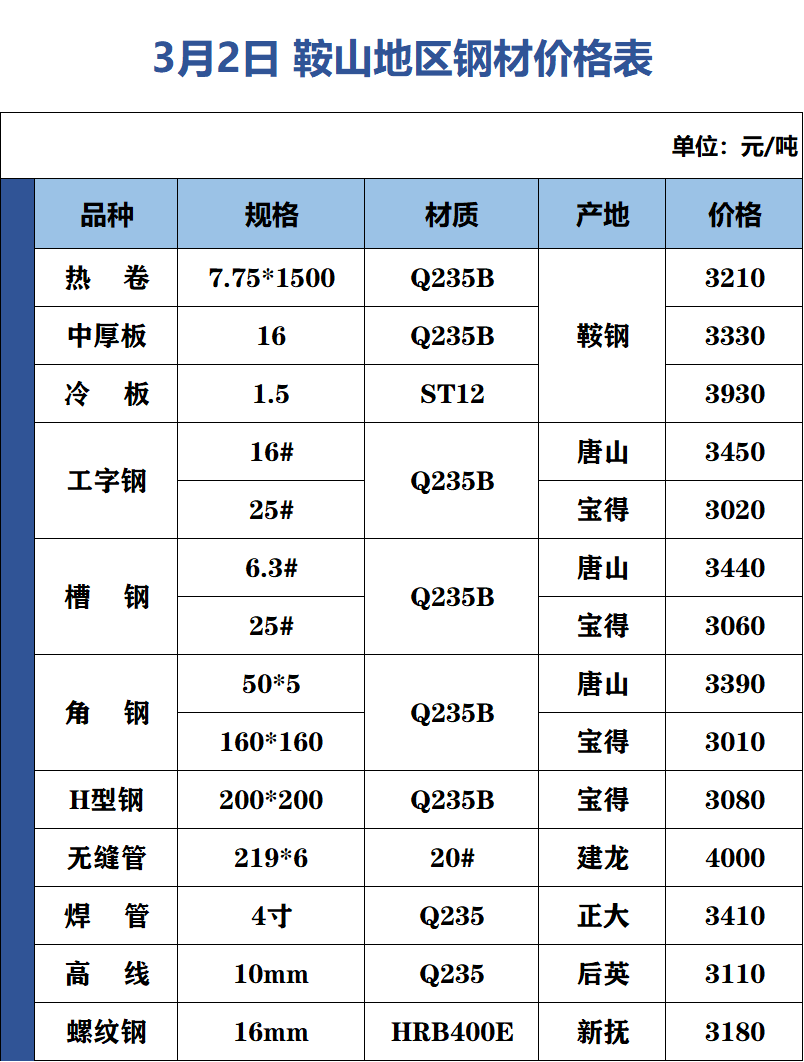 3月2日 鞍山地區(qū)鋼材價(jià)格表