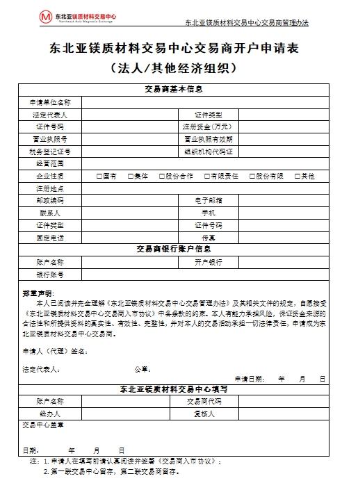 第五條 申請交易中心交易商,須填寫《交易商開戶申請表》,并按交易中心要求提供相關(guān)文件。
