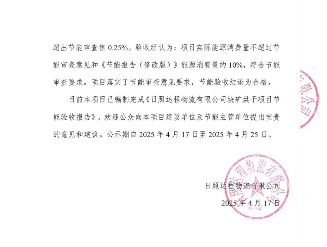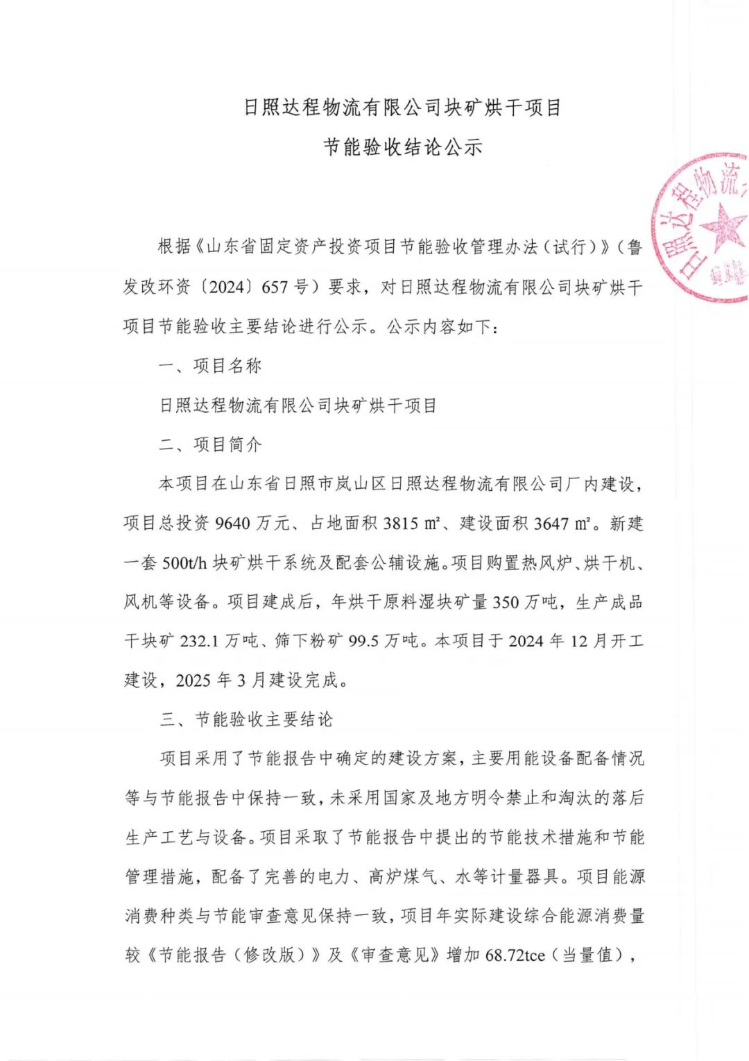 近日,日照鋼鐵控股集團有限公司官網(wǎng)發(fā)布《日照達程物流有限公司塊礦烘干項目節(jié)能驗收公示》——
